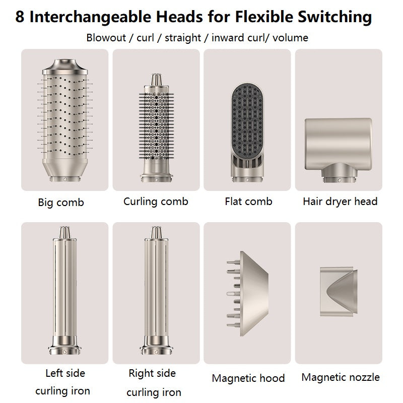 - All-in-One Versatility: 8 heads cover blow-drying, curling, straightening, volume boosting—replaces multiple single-function hair tools.